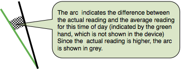 The arc indicates the difference between the actual reading and the average reading for this time of day (indicated by the green hand, which is not shown in the device) Since the actual reading is higher, the arc is shown in grey.The differential indicator hows the deviation of the actual pulse balance from the average pulse balance for the same time of day. So it constitutes a hint to the patient, if he should be more (grey arc to the left) or less (black arc to the right) active, to make up for a balanced day.